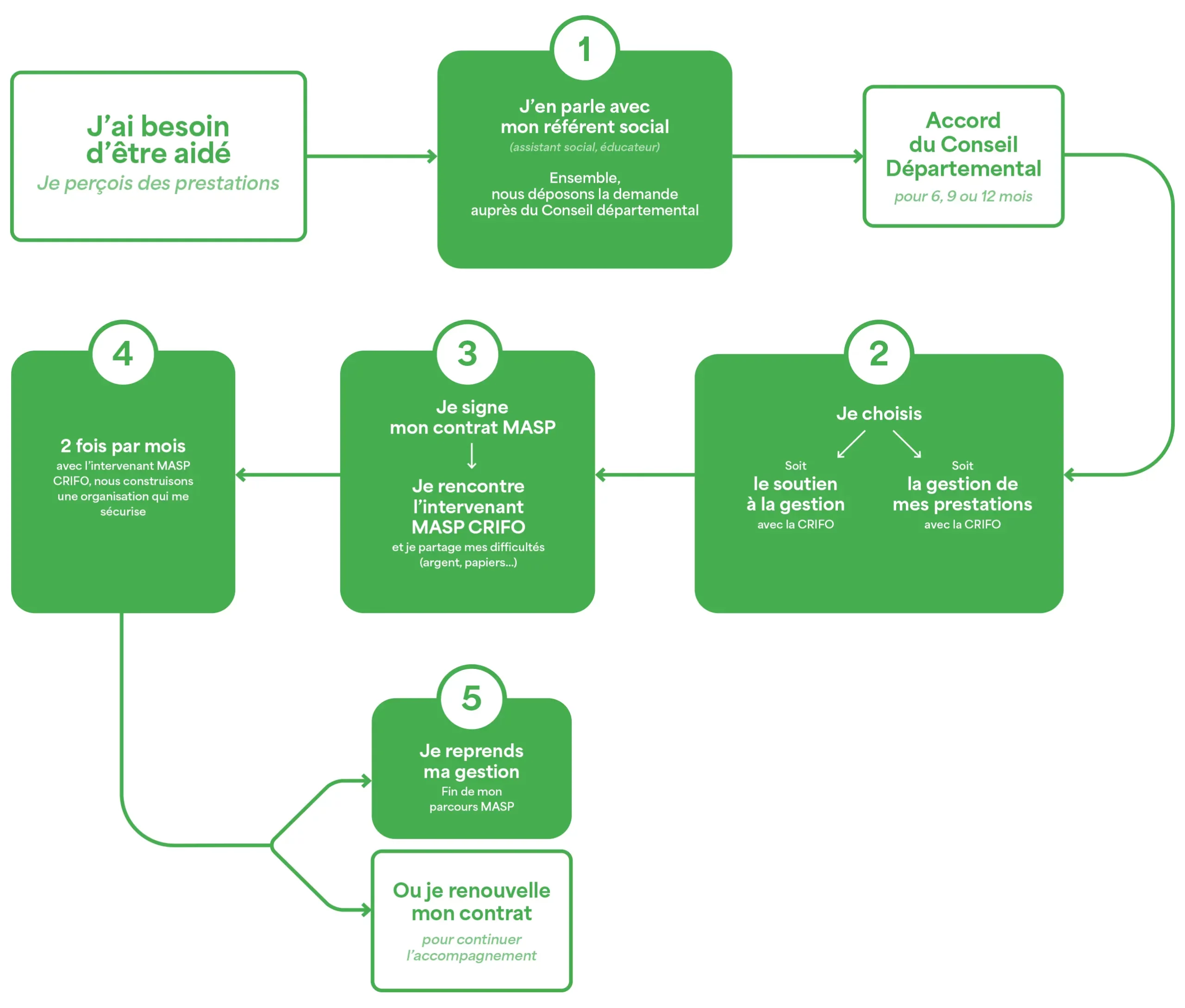 Il existe aussi la mesure d’accompagnement social personnalisé avec gestion qui intègre un accompagnement plus approfondi avec le suivi des prestations sociales (MASP 2).